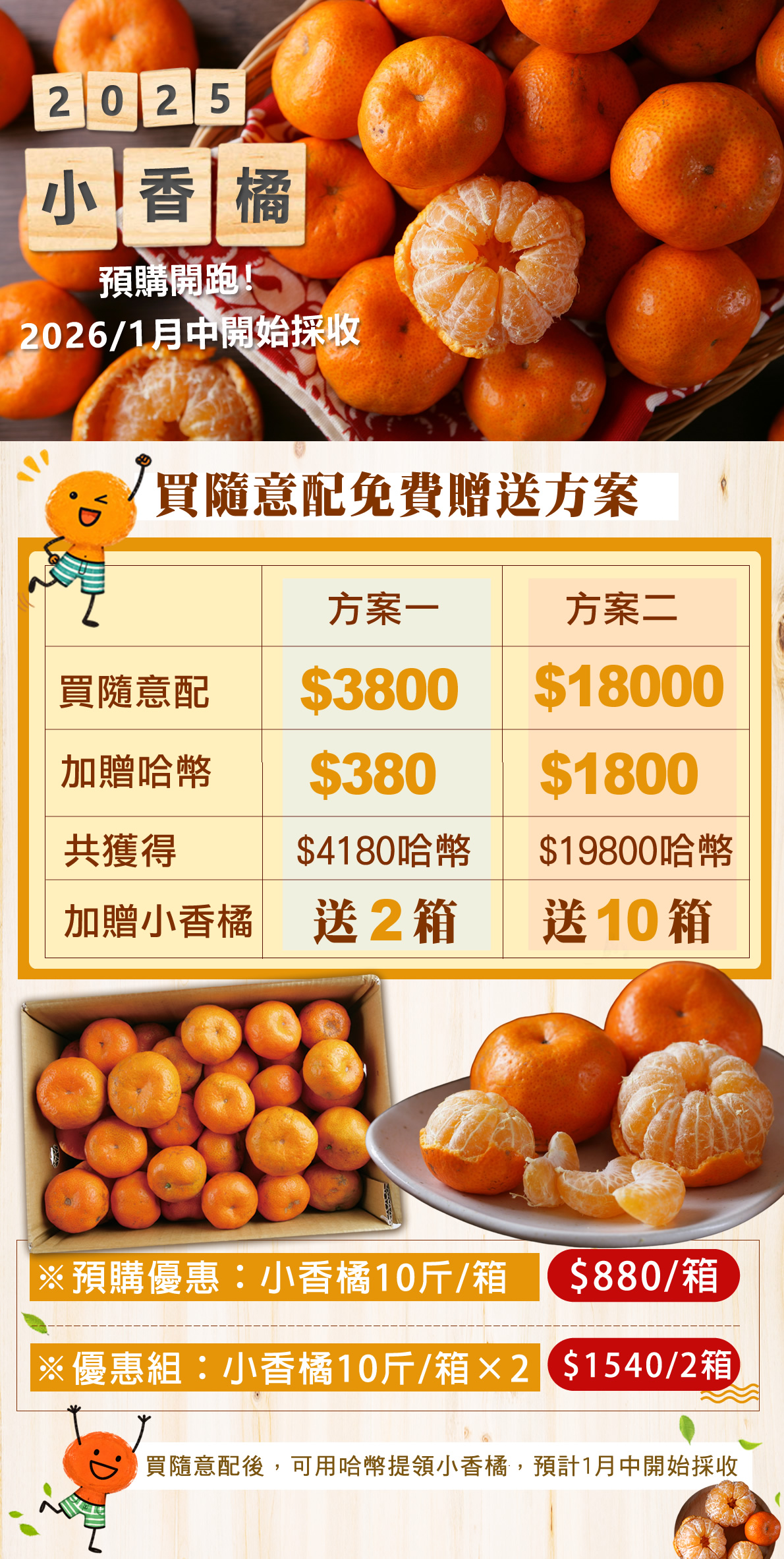 購買隨意配$3800,贈送【二箱】關子嶺小香橘(砂糖橘)10斤/箱