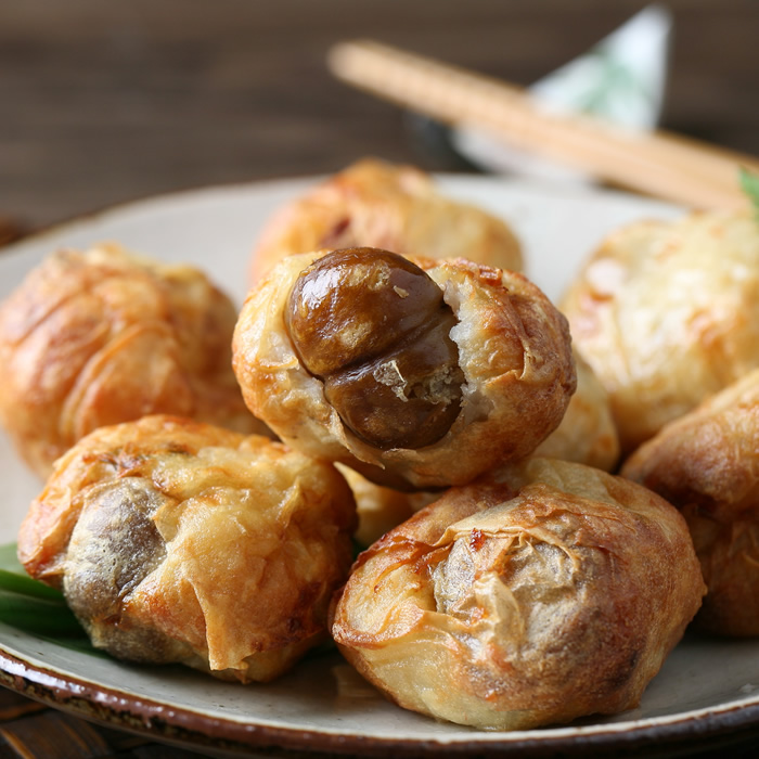 特色: | ■ 清爽腐皮取代網油,包覆鮮蝦肉漿以及整顆栗子,創造豐富口感以及層次美味。 ■ 以氣炸或油炸調理,品嘗金黃酥脆的腐皮、鮮美Q彈蝦球,再搭配鬆軟甜蜜的栗子,令人回味的絕妙滋味。 |