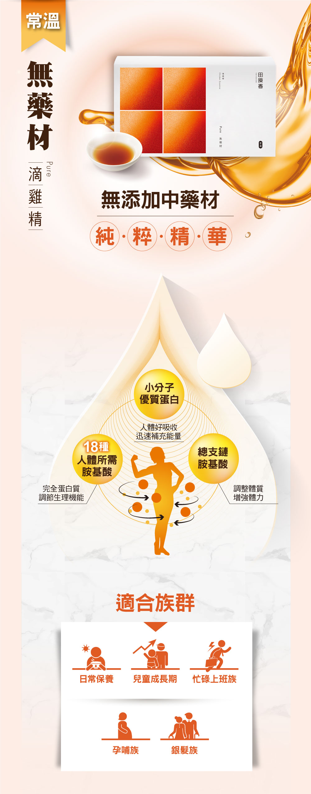 | 特色: | 滴雞精是運用傳統方法,以手工一滴滴萃取出來的100%純土雞汁,滴雞精含有豐富的膠質,以及蛋白質與側鏈胺基酸等小分子營養,比起一般食物更能讓身體吸收,也是懷孕媽媽補充體力和營養的健康食品。 | ||||||||||||||||||||||||