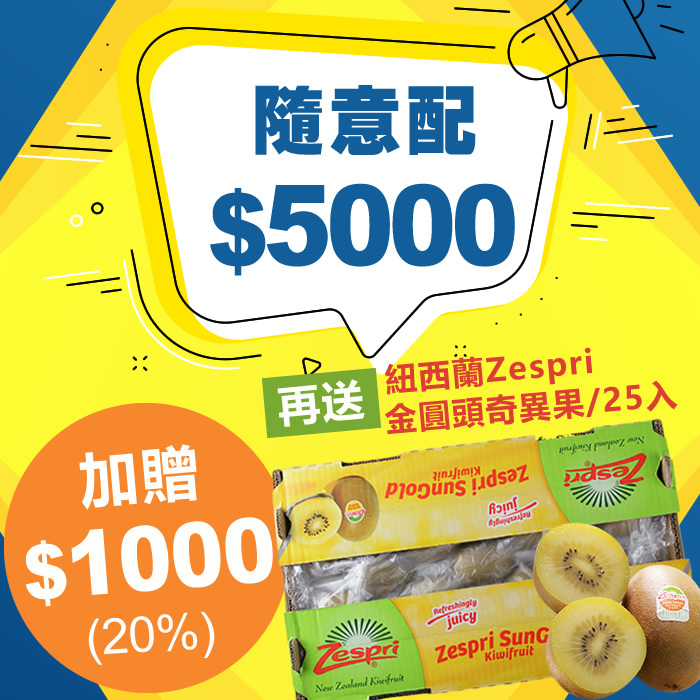 【周末快閃】HUG隨意配(購買NT$5000,即得$1000哈幣回饋)加贈紐西蘭Zespri陽光金圓頭奇異果/25入