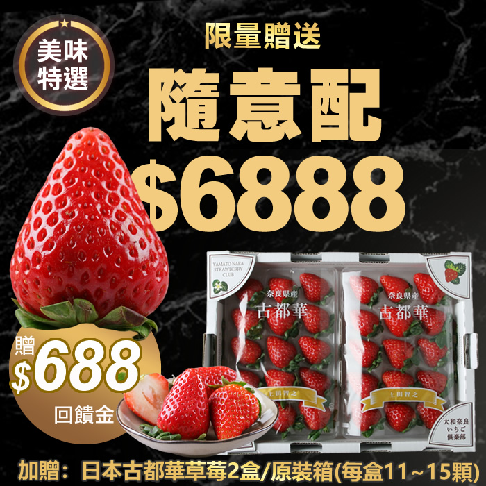 【美味特選】HUG隨意配(購買NT$6888,即得$688哈幣回饋)+日本古都華草莓2盒(每盒11~15顆)/原裝箱
