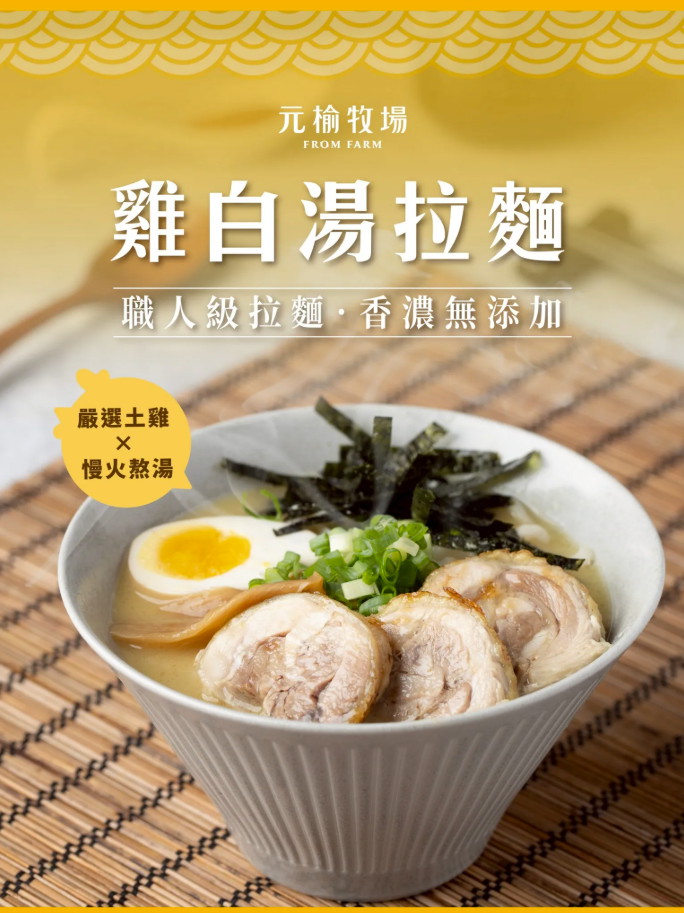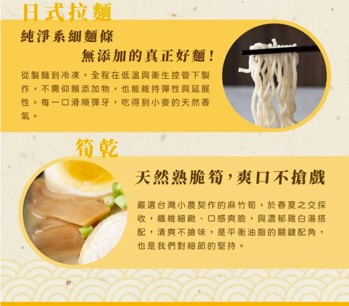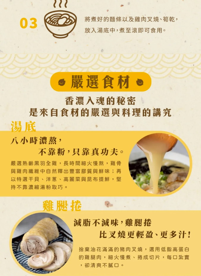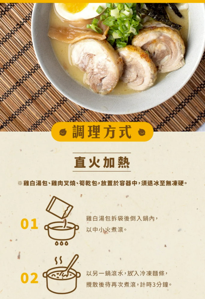 | 內容物: | ■雞白湯包/水、黑羽土雞、高麗菜、洋蔥、蒜、蔥、昆布、釀造醬油、米酒(米、精製食用酒精)、鹽、乾干貝 *以上食材為熬湯使用,製程中已過濾去除 ■拉麵包/小麥麵粉、水、食鹽 ■雞肉叉燒/黑羽土雞、釀造醬油、水、米酒(米、精製食用酒精)、蒜、薑、白胡椒粉 ■筍乾包/水、筍片、釀造醬油、雞油、糖、米酒(米、精製食用酒精)、黑糖(二砂糖、糖蜜)、鹽、蒜 |