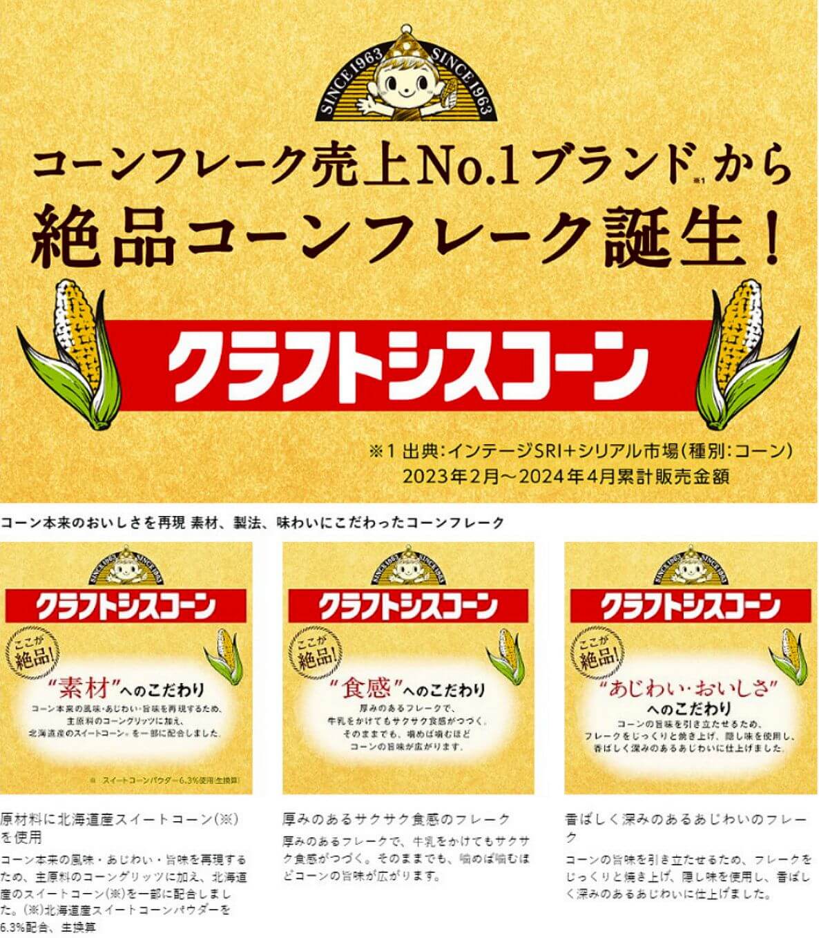▼ 為了重現玉米的原始美味,除了玉米粗粉,更加入北海道產甜玉米,在製法與風味上精心講究,厚片玉米片經慢火烘焙,香脆濃郁。