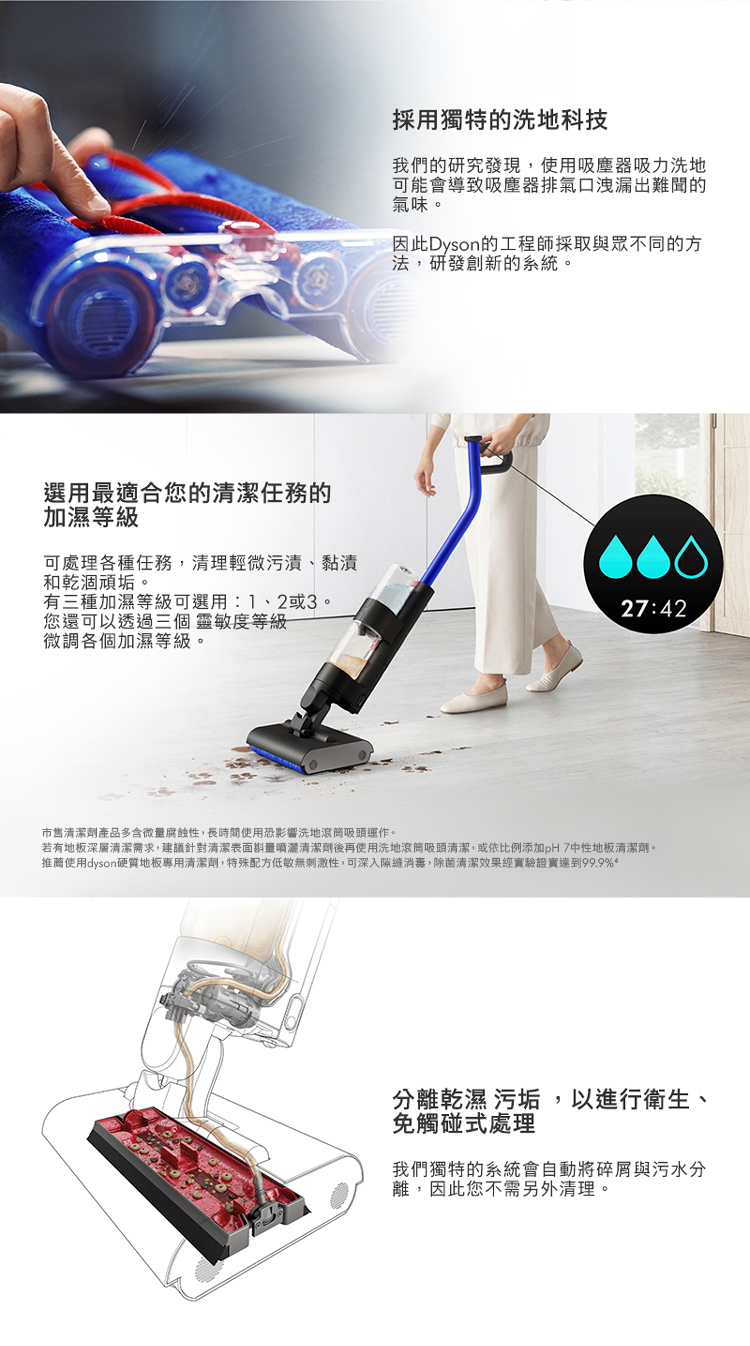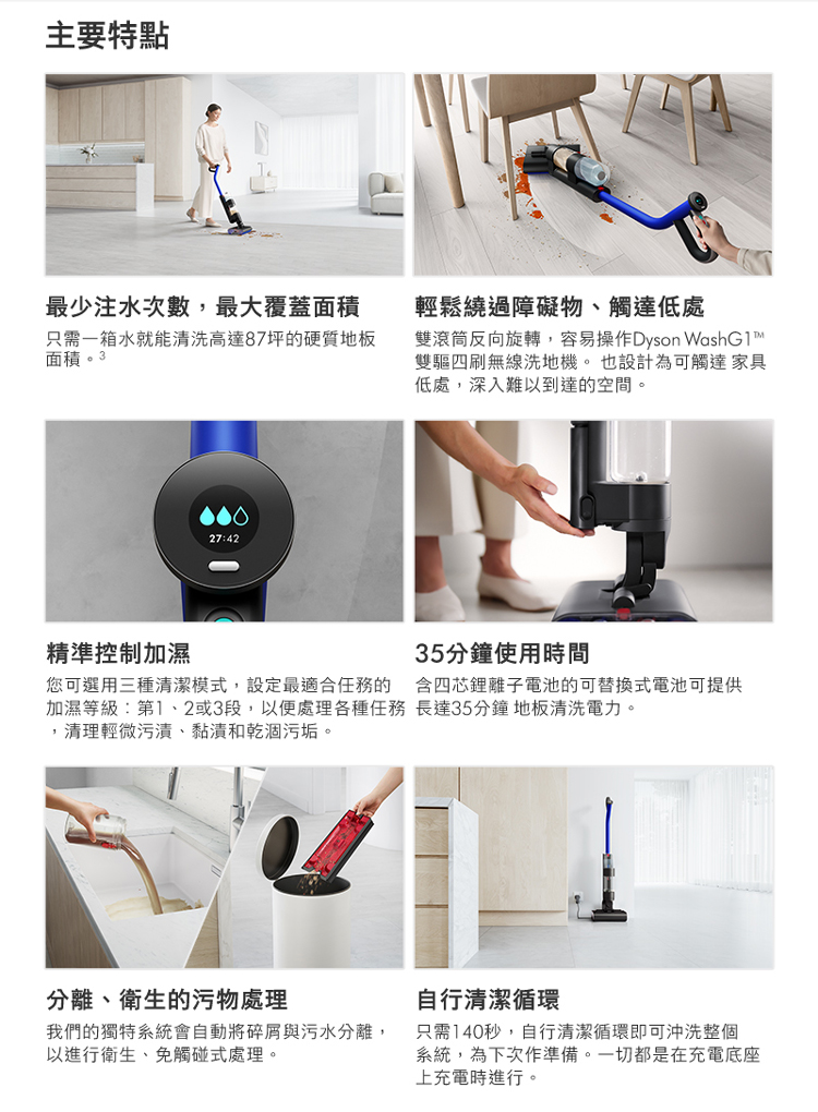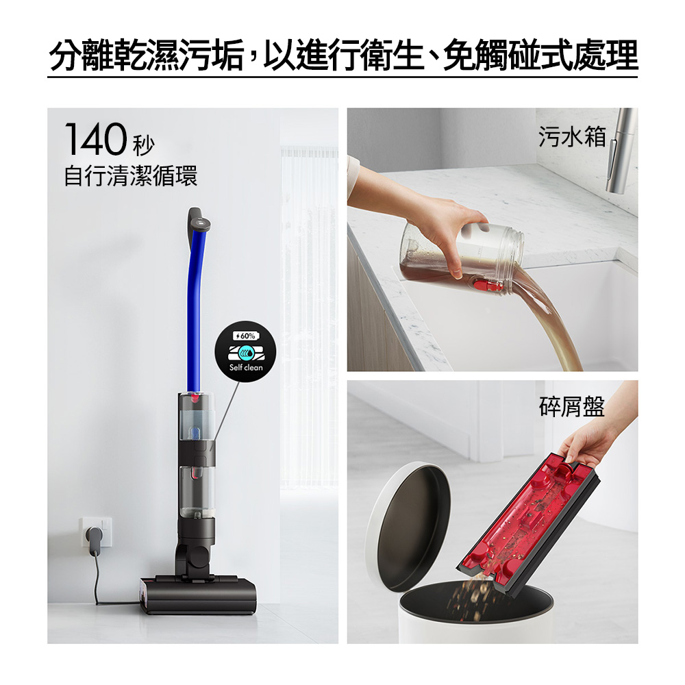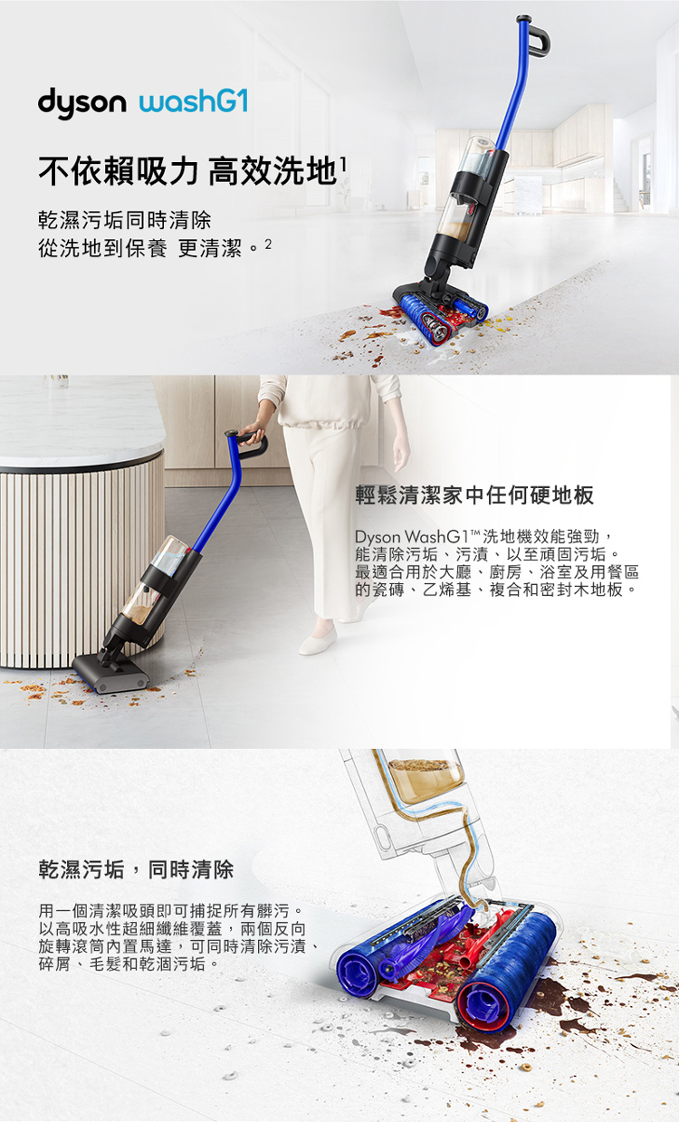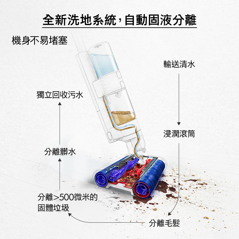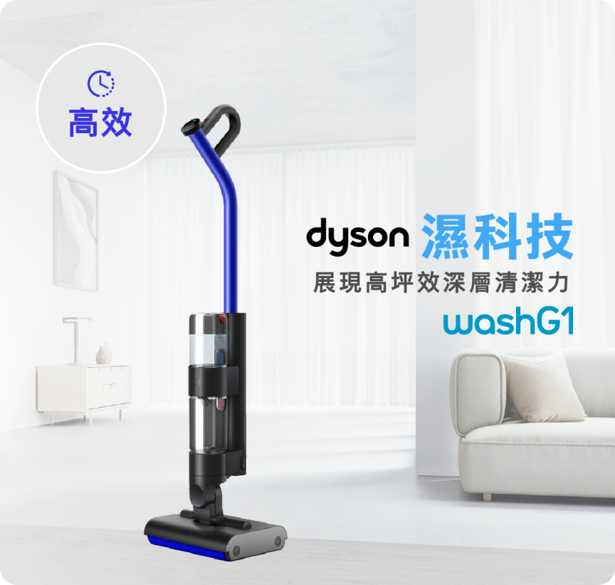 Dyson 首款結合吸塵與洗地科技的旗艦新品,搭載創新「雙驅四滾刷系統」,前後對轉同步清洗並吸除污水,讓地面瞬間潔淨乾爽。乾淨水與污水全程分艙運作,確保每一次拖地皆使用清水。使用後一鍵自動清潔與風乾滾刷,免手洗更衛生。智慧感應系統會依髒汙程度自動調整水量與吸力,LED 螢幕即時顯示清水與電量狀態。無線設計輕盈靈活,續航長達 35 分鐘。Dyson WashG1,專為追求完美潔淨的家庭打造。