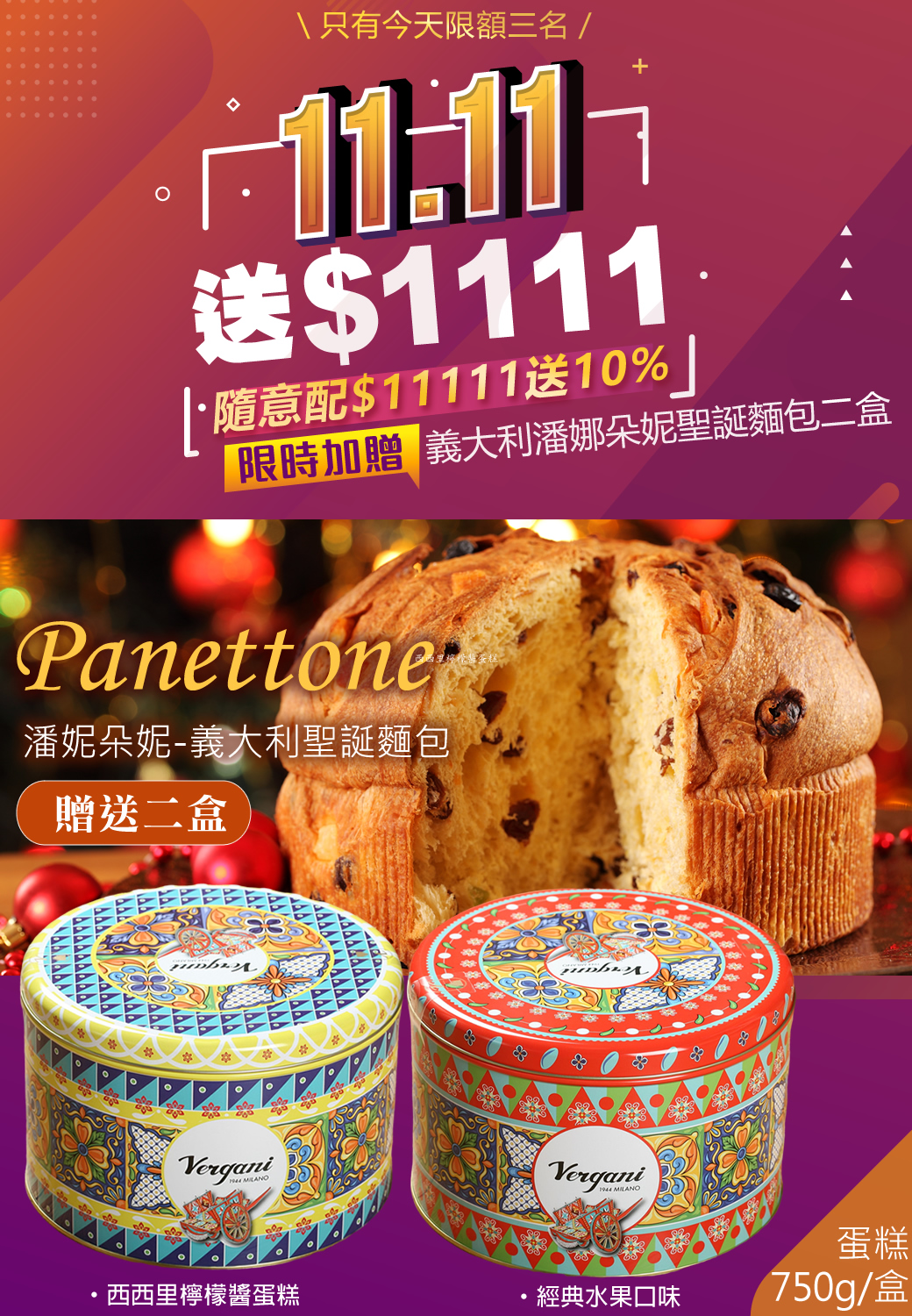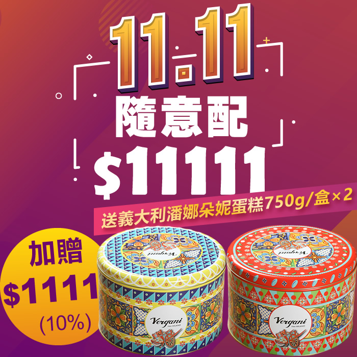 【雙11好評延長】HUG 隨意配(購買NT$11111,即得$1111哈幣回饋)加贈新款Vergani義大利潘娜朵妮西西里聖誕蛋糕(鐵盒裝)/750g×2盒
