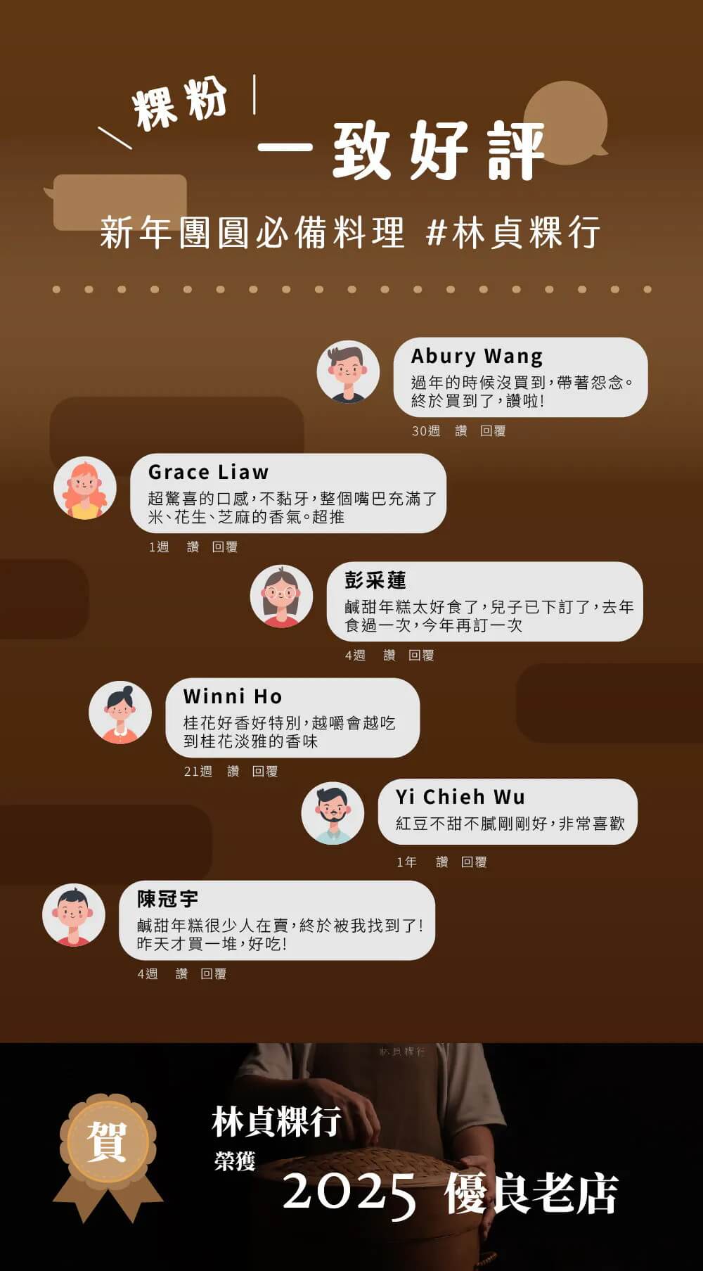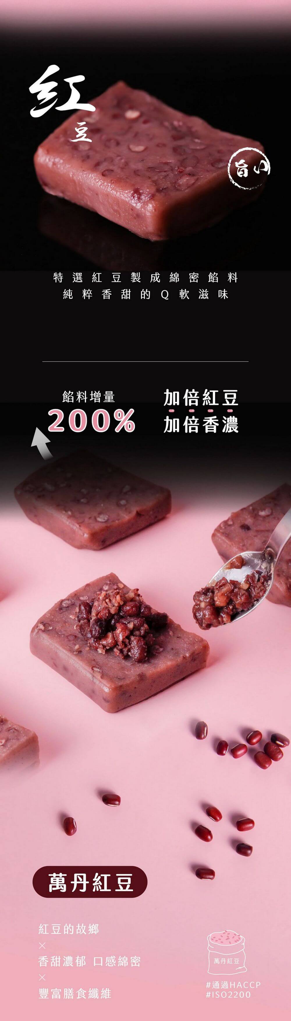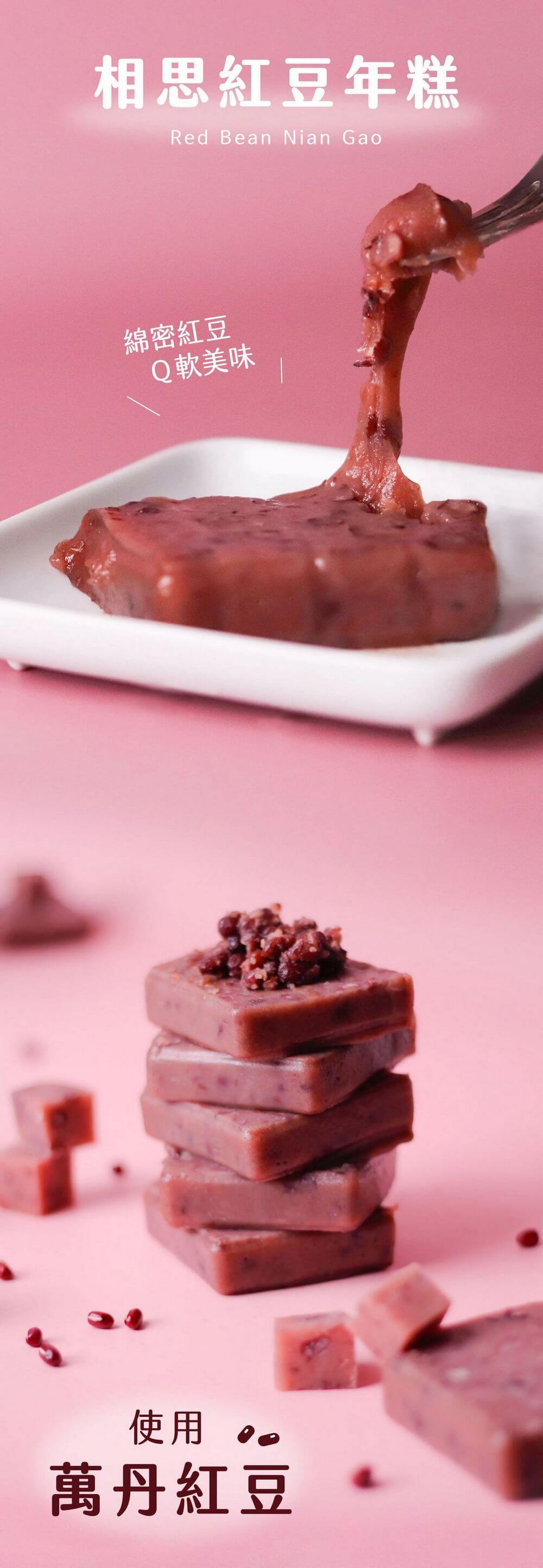 | 特色: | ■ 使用紅豆的故鄉「萬丹」生產的高品質紅豆,添加雙倍紅豆餡料,香甜濃郁口感綿密。 ■ 特選萬丹紅豆、 雙倍餡料大滿足、 無添加防腐劑色素。 ■ 翻轉傳統年糕印象,每一口都吃得到自然美味餡料,味蕾升級 。 ■ 媒體報導迪化街傳承三代美味,美食部落客強力推薦「必吃年菜」。 ■ 承先啟後,劃時代年糕誕生,色彩繽紛的創新年糕。 |