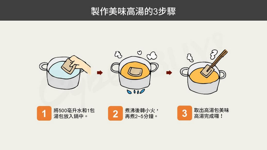 | 料理建議: | ★可用於製作高湯。 ★也可作為調味料使用:撕開湯包將內容物取出,可作為飯糰佐料、或是炒飯、炒麵的調味料。 |