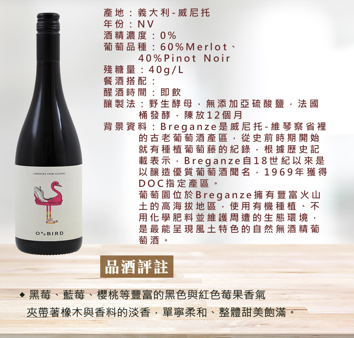 | 特色: | ■ 真正無酒精之葡萄酒製程,0%無酒精,低熱量,品飲無負擔。 ■ 葡萄園位於DOC指定產區-Breganze,擁有豐富火山土的高海拔地區,使用有機種植、不用化學肥料並維護周遭的生態環境,是最能呈現風土特色的自然無酒精葡萄酒。 ■ 黑莓、藍莓、櫻桃等豐富的黑色與紅色莓果香氣,夾帶著橡木與香料的淡香,單寧柔和、整體甜美飽滿。 |