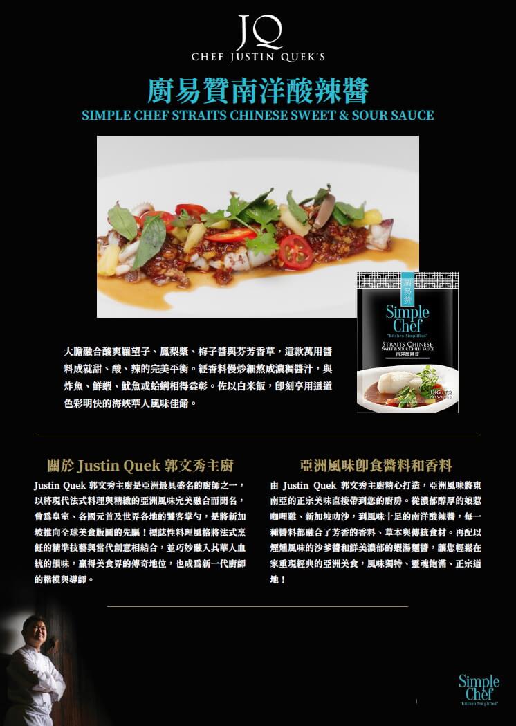 | 特色: | ■ Justin Quek 郭文秀主廚是亞洲最具盛名的料理大師,以現代法式技藝融合亞洲風味聞名,曾為皇室、各國元首及世界饕客掌勺,是新加坡躍上全球美食版圖的先驅。他的料理風格結合法式烹飪的精準與創意,並融入華人血統的獨特韻味,奠定美食界傳奇地位,也成為新一代廚師的楷模。 ■ 由郭文秀主廚打造的亞洲風味系列,將東南亞正宗美味帶入您的廚房。從濃郁的娘惹咖哩雞、新加坡叻沙,到酸辣鮮明的南洋醬料,每款皆融合香料、草本與傳統食材,讓您在家即可輕鬆重現經典亞洲料理,風味飽滿、正宗道地。 |
