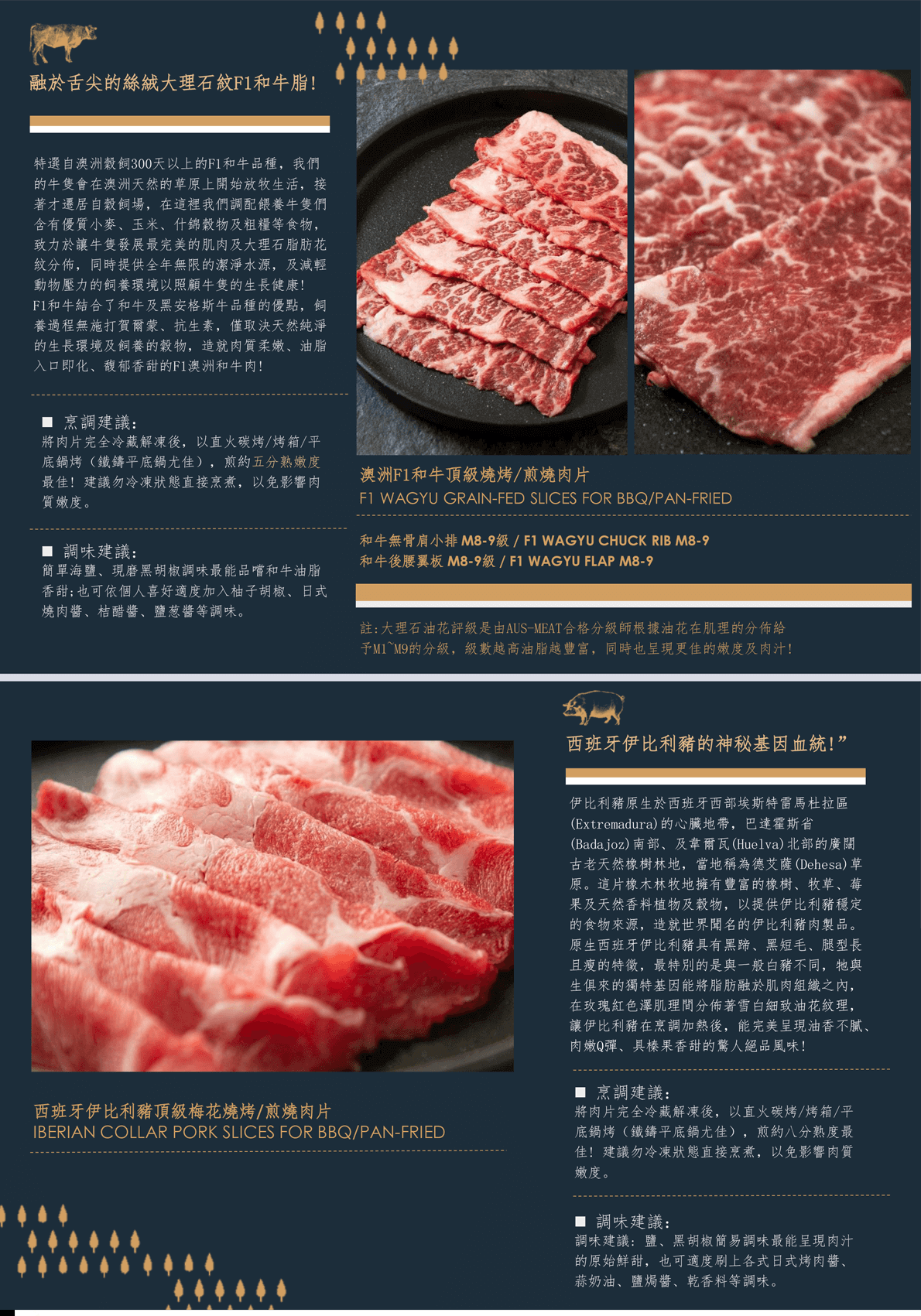 | 特色: | ‧ 澳洲穀飼F1和牛:特選自澳洲穀飼300天以上的F1和牛,可感受融於舌尖的絲絨的和牛脂! ‧ 西班牙伊比利豬:具榛果香甜的歐洲夢幻食材。 ‧ 歐洲藍(螯)龍蝦:爽脆口感+細緻鮮嫩的肉質! ‧ 法國頂級艾許奶油:香醇濃厚的乳脂+淡淡榛果香。 |