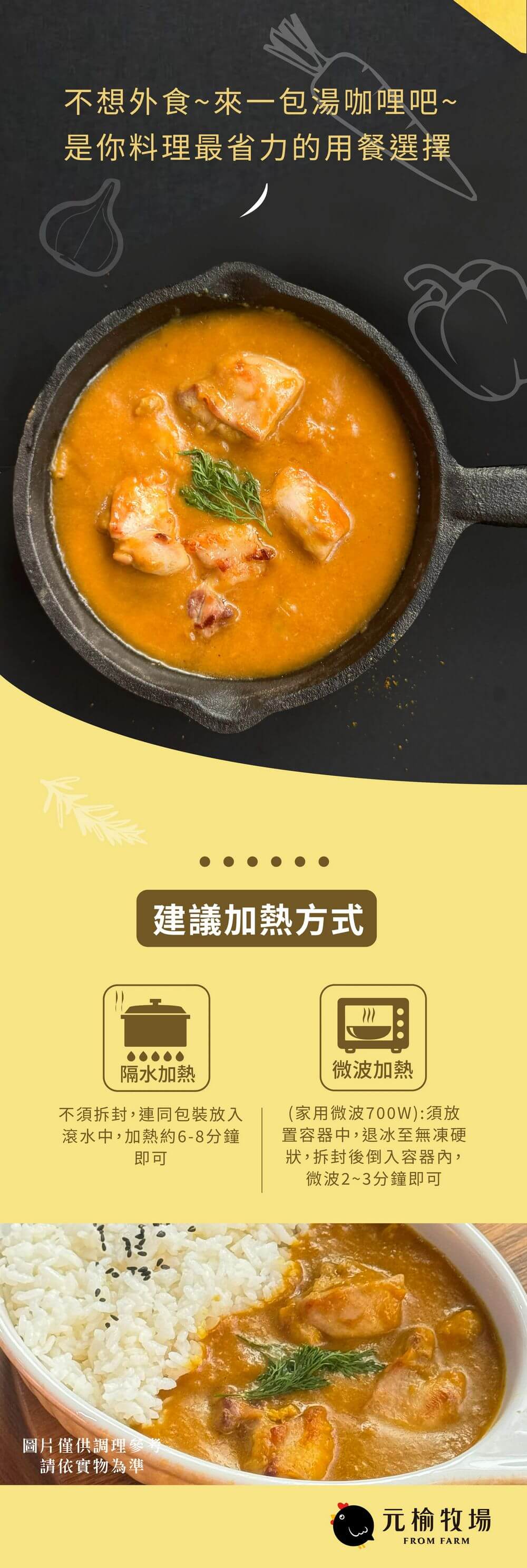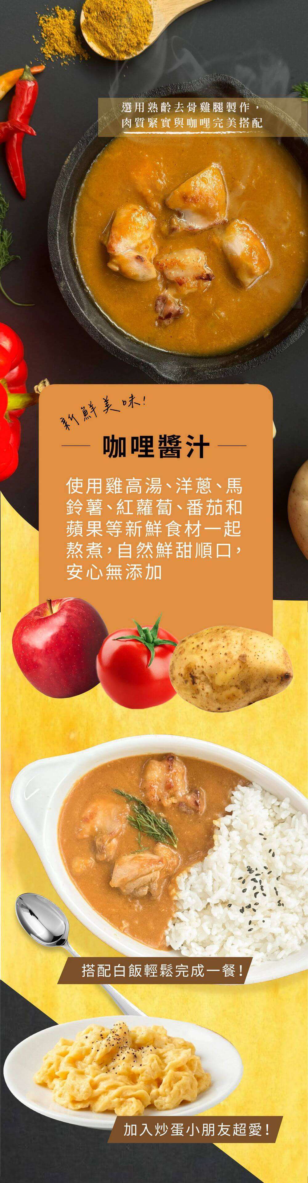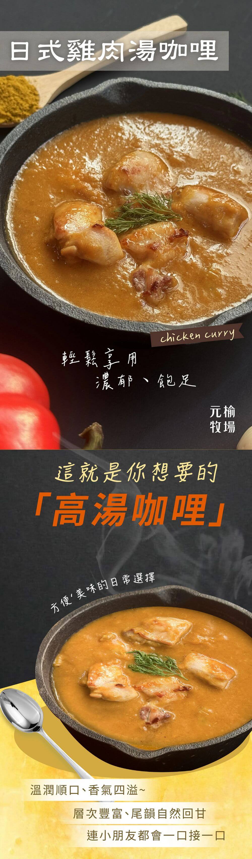 | 特色: | ■ 神農獎衝浪雞熬製的高湯,做成溫潤順口的日式甘口湯咖哩,雞肉與蔬果的自然鮮甜,大人小孩都愛吃,一口接一口停不下來。 ■ 貼心使用去骨雞腿切丁,嚴選神農獎衝浪雞,自然放牧熟齡黑羽雞,久燉不柴、肉質緊實Q彈。 ■ 通過SGS與中央畜產會雙認證,無抗生素/無藥殘,健康無添加。 ■ 退冰加熱即可食用,隨時都能快速完成一份香氣四溢的咖哩。 |