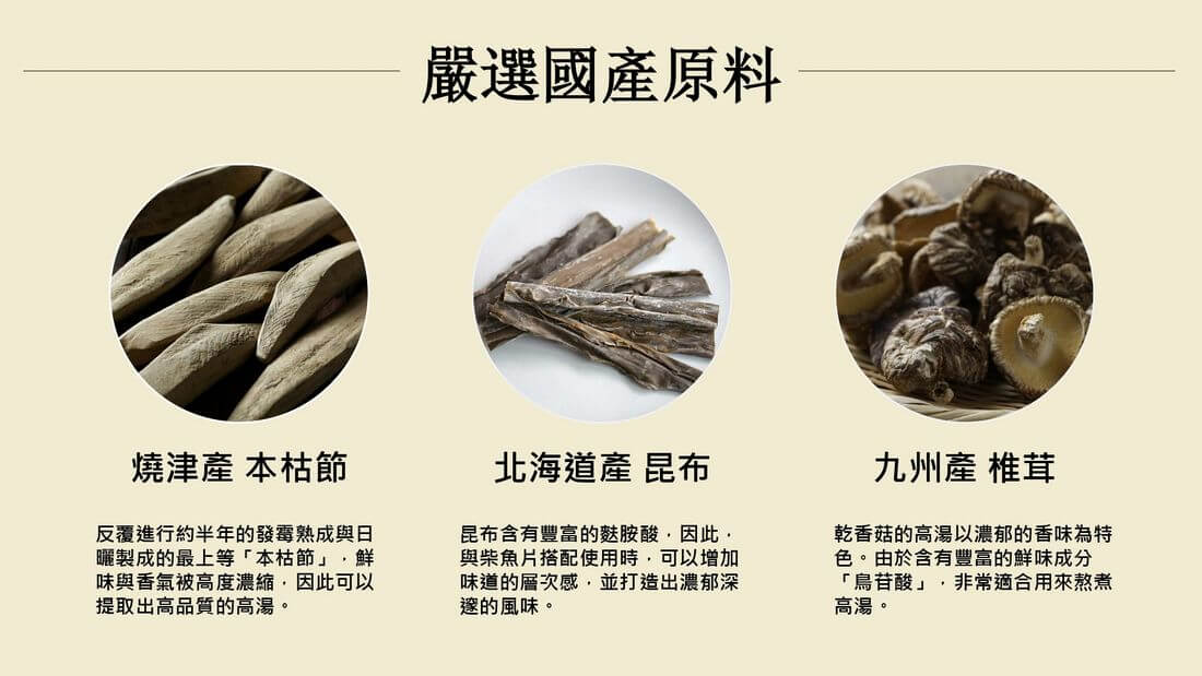 | 特色: | ■ 嚴選日本三大高湯原料:採用燒津產最上等本枯節,經半年熟成與日曬,鮮味與香氣極致濃縮。 ■ 搭配北海道昆布,富含麩胺酸,提升湯底層次與深度。 ■ 再加上九州乾香菇,蘊含鳥苷酸,香氣濃郁,鮮味飽滿。三者交織,打造出醇厚、深邃且極具風味的高品質湯底。 |