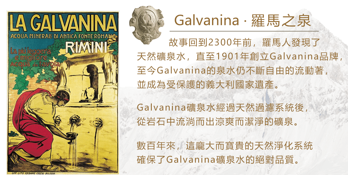 | 特色: | ■ Galvanina義大利最古老天然礦泉,為20世紀時受皇家貴族喜愛選用之品牌。 ■ 天然礦泉水含豐富礦物質,搭配天然高品質水果以高超冷凍技術保留其營養與果香風味。 |