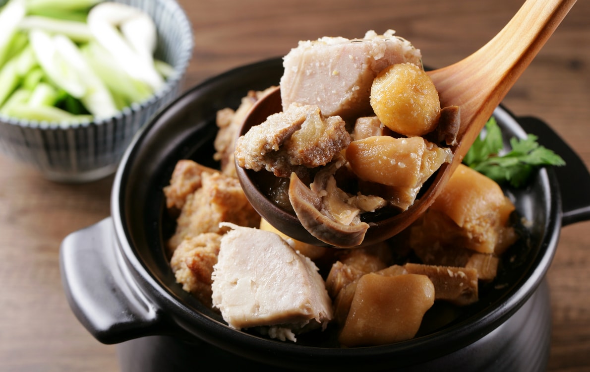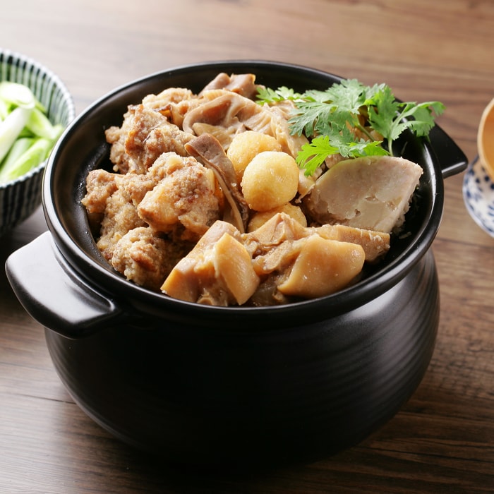 | 特色: | 以豬腳、水翅、排骨、芋頭、肚絲、栗子、香菇、鳥蛋、紅棗、大白菜等等豐富食材一同煨燉,香濃湯頭入口溫醇回甘。豐富用料但又不使湯頭油膩濃稠,反而是清爽香醇的口感。 | ||||||||||||||||||||||||
