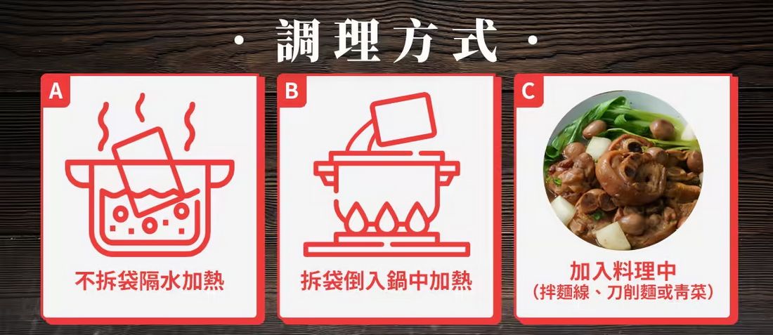 瓦斯加熱:將產品開袋倒入鍋內,以小火加熱,煮至沸騰即可。
