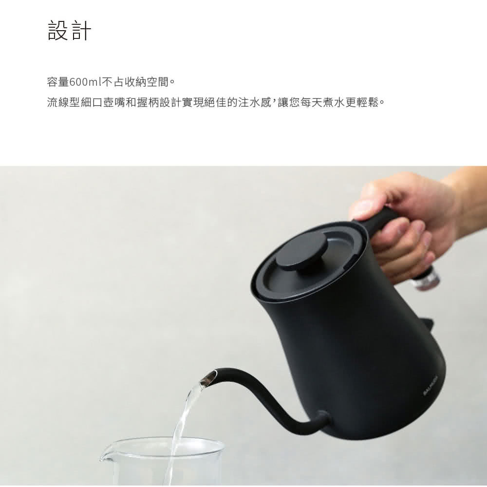 細長壺嘴搭配人體工學握柄,水流柔順精準,無論手沖咖啡或泡茶都能輕鬆掌控。 -