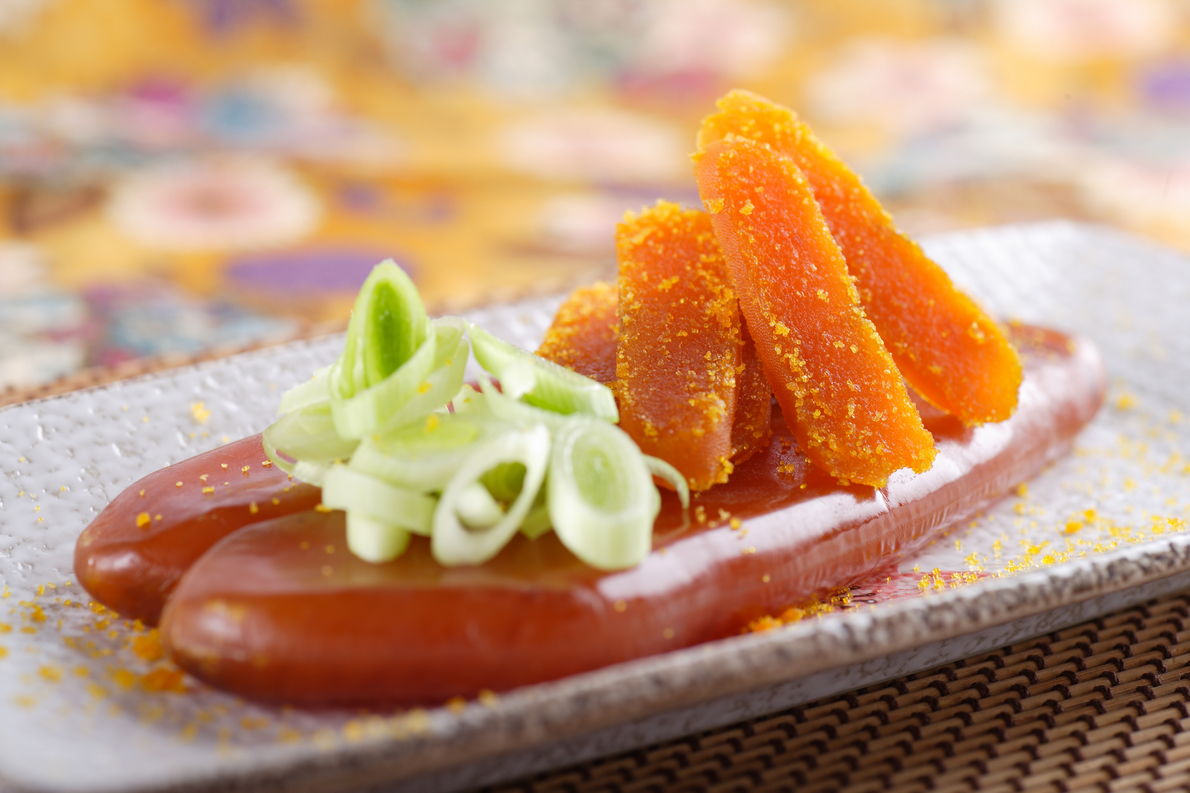 | 料理建議: | ■ 油炸:將烏魚子兩面浸泡米酒約5分鐘,去除表面薄膜,入溫油炸(油溫約160°C),炸約 5∼8 秒鐘至表面略為膨起即可。 ■ 香煎:將少量的米酒倒入平底鍋中,放入烏魚子兩面煎至酒精完全揮發。 ■ 火烤:以尖叉將烏魚子表面插小洞,浸泡於高梁酒中5分鐘後撕掉外膜,取出後用筷子或夾子夾住烏魚子,放在點火的高梁酒上火烤,烤至表面變色即可。 |