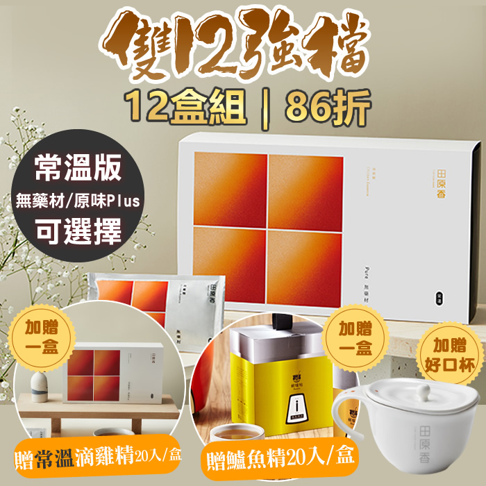 - 雙12限定【12盒86折】常溫|無藥材滴雞精(20包/盒)+(加贈)無藥材常溫滴雞精20入+鮮味帖冷凍鱸魚精萃20入+好口杯(約250cc)