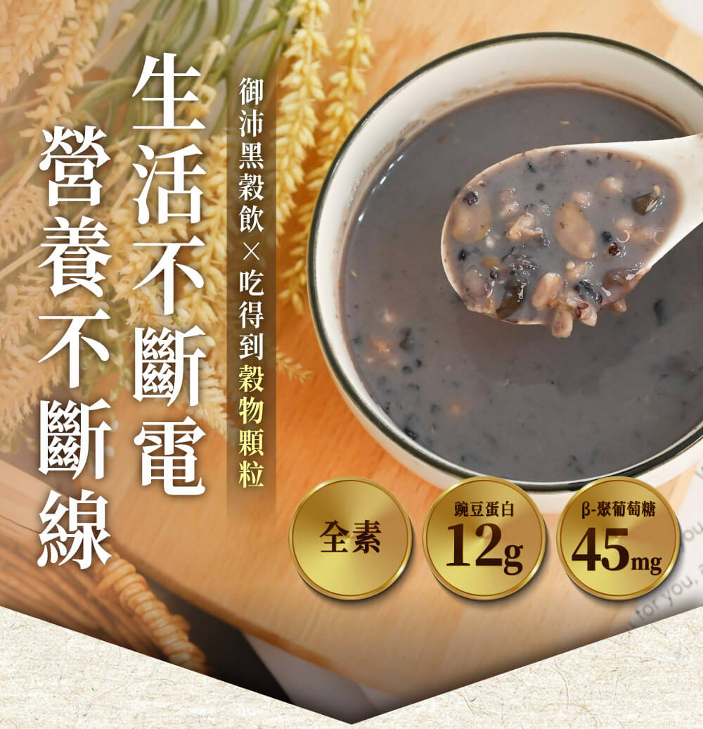 | 特色: | ◎吃得到真實穀物顆粒,綿密好入口 ◎低糖低鈉無負擔,冷熱飲都美味 ◎本產品含黑米、黑豆、黑芝麻、紅薏仁、紅藜麥、燕麥仁 ◎添加豌豆蛋白質:優質植物蛋白質來源 ◎添加β-聚葡萄糖;調節生理機能最佳營養成分 ◎即開即飲免烹煮,常溫保存更便利 |