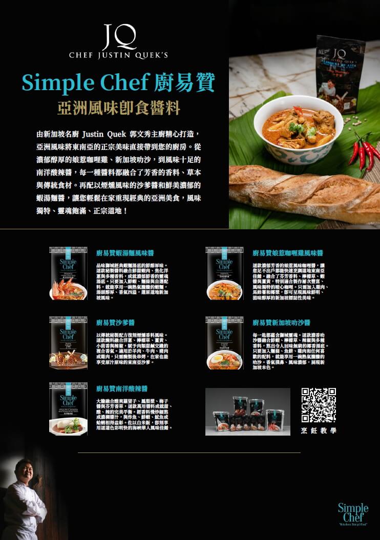 | 特色: | ■ Justin Quek 郭文秀主廚是亞洲最具盛名的料理大師,以現代法式技藝融合亞洲風味聞名,曾為皇室、各國元首及世界饕客掌勺,是新加坡躍上全球美食版圖的先驅。他的料理風格結合法式烹飪的精準與創意,並融入華人血統的獨特韻味,奠定美食界傳奇地位,也成為新一代廚師的楷模。 ■ 由郭文秀主廚打造的亞洲風味系列,將東南亞正宗美味帶入您的廚房。從濃郁的娘惹咖哩雞、新加坡叻沙,到酸辣鮮明的南洋醬料,每款皆融合香料、草本與傳統食材,讓您在家即可輕鬆重現經典亞洲料理,風味飽滿、正宗道地。 |
