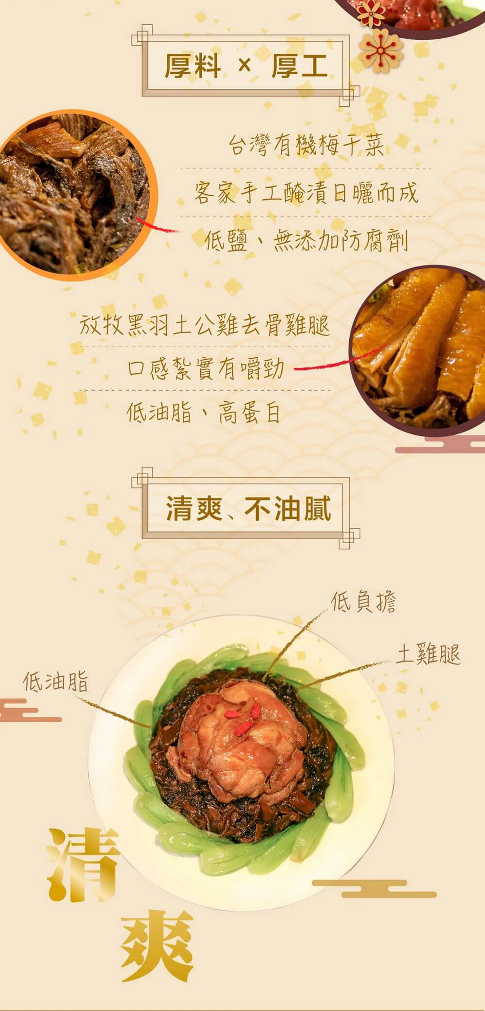 | 成分: | 黑羽土雞腿肉、水、無添加醬油、梅乾菜、紹興酒、冰糖、蒜、薑、雞油、白胡椒、辣椒、八角 | ||||||||||||||||||||||||
