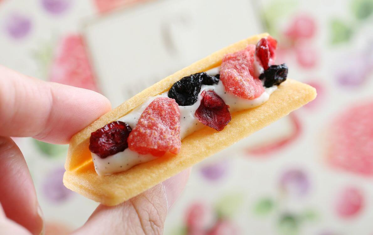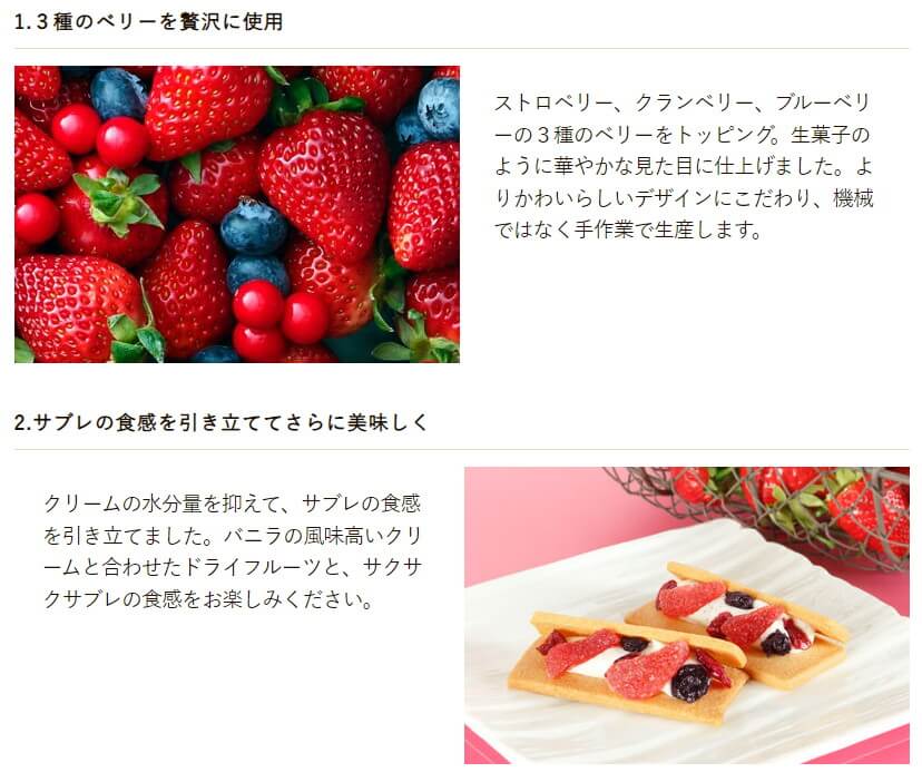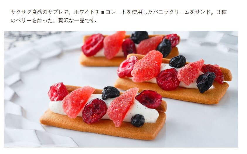 | 特色: | ■ 餅乾質地酥脆,使用白巧克力香草奶油,搭配三種莓果果乾:草莓、蔓越莓和藍莓,外觀像新鮮的糖果一樣華麗。 ■ 注重可愛的造型設計,並以手工而非機器生產。 ■ 特別降低奶油的含水量,凸顯了餅乾的質感。品嘗梅果與香草奶油的結合以及餅乾體的酥脆口感。 |