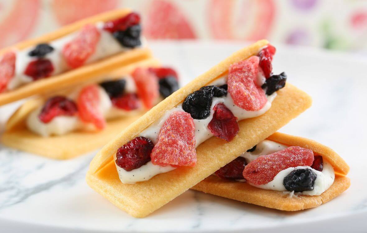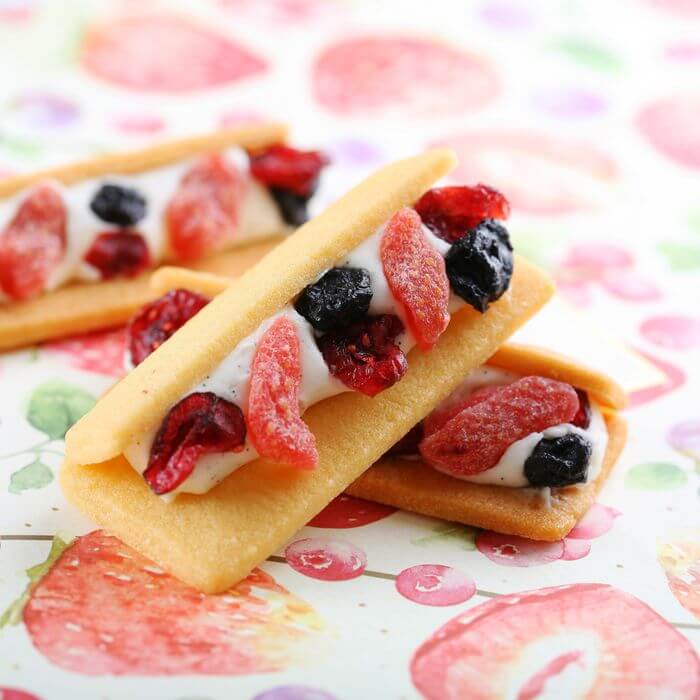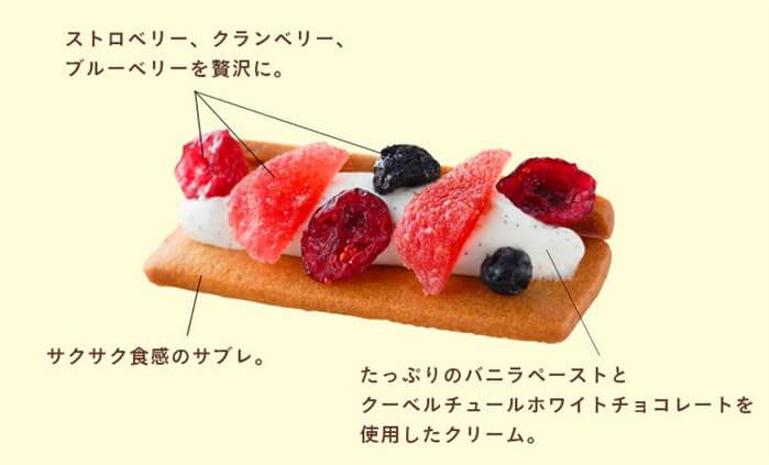 ■ 餅乾質地酥脆,使用白巧克力香草奶油,搭配三種莓果果乾:草莓、蔓越莓和藍莓,外觀像新鮮的糖果一樣華麗。
