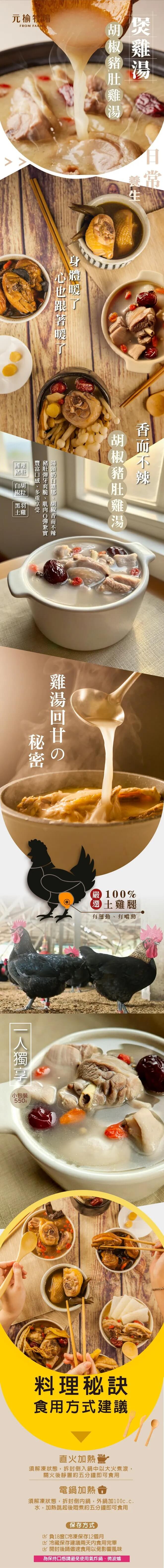 | 特色: | ■ 元榆胡椒豬肚雞湯,湯頭奶白濃郁、胡椒香而不辣! ■ 嚴選國產安心豬肚,口感彈牙爽脆,和土雞腿肉搭配豐富口感、多重享受。 ■ 嚴選16週以上自然放牧黑羽土雞,久燉不柴、肉質緊實Q彈、低脂高蛋白 ■ 保證新鮮衛生:全程低溫清洗分切,並真空包裝後急速冷凍。 ■ 真空包裝的即食料理,輕鬆即可上菜。 ■ 通過SGS與中央畜產會雙認證,無抗生素/無藥殘,健康無添加。 |