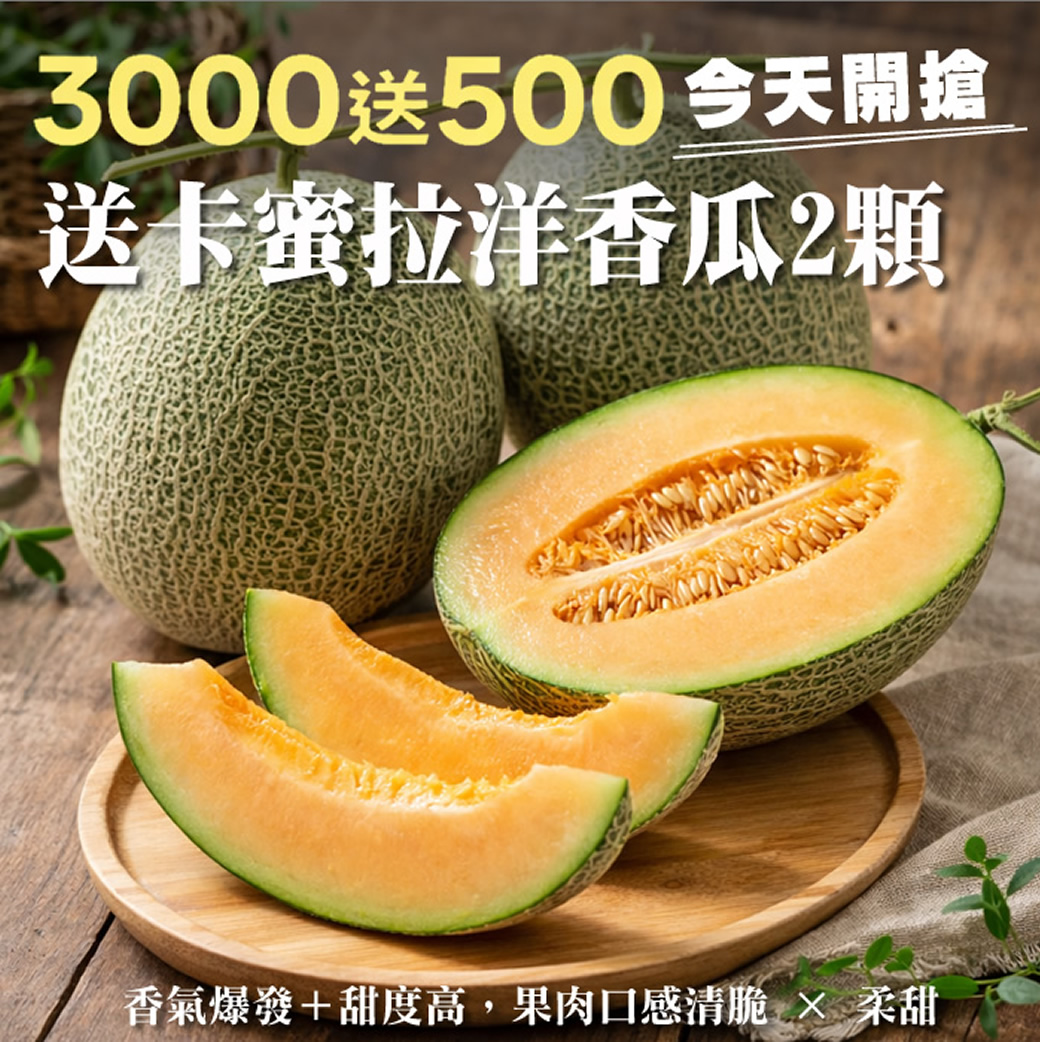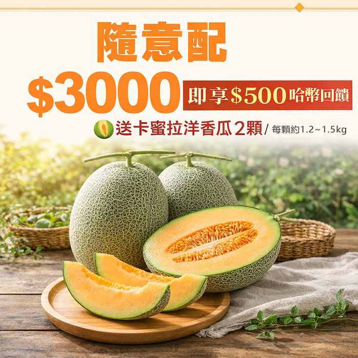 【限量開搶】HUG隨意配(購買NT$3000,即得$500哈幣回饋)加贈卡蜜拉洋香瓜2顆/每顆約1.2~1.5kg