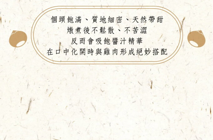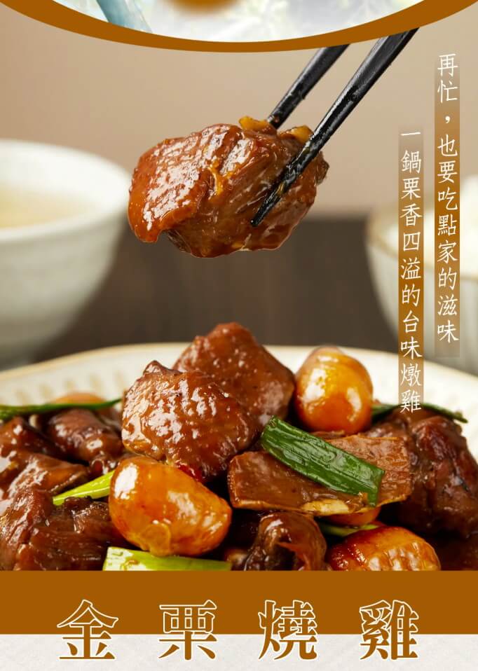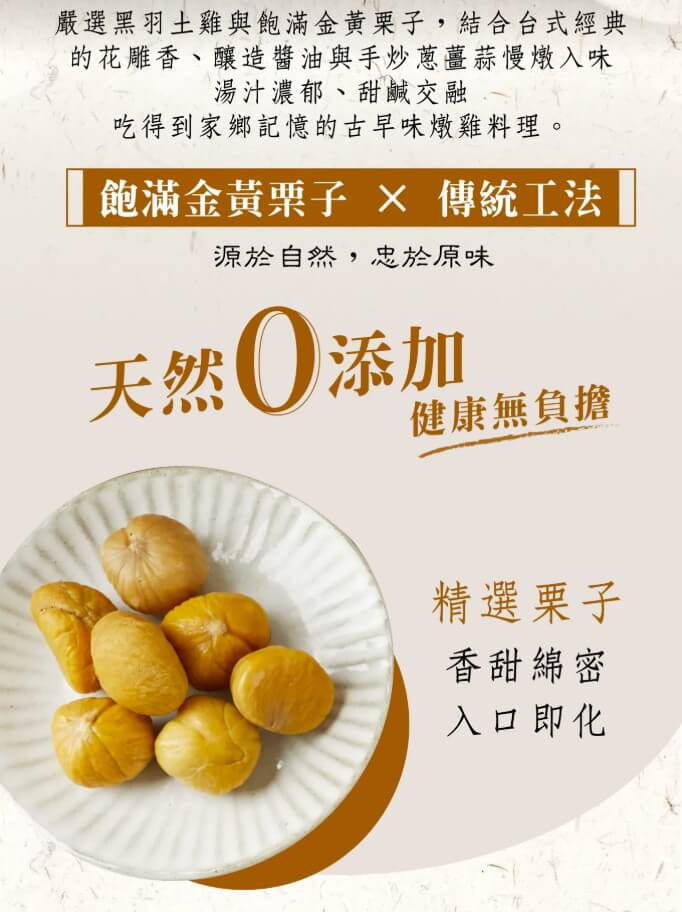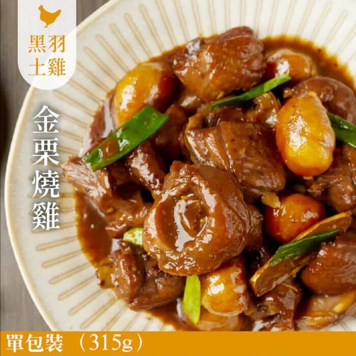| 內容物: | 黑羽土雞、水、栗子、雞高湯(水、黑羽土雞)、釀造醬油、花雕酒(米、小麥)、雞油、糖、樹薯粉、 油膏(水、黑豆、糖、鹽、糯米、甘草)、蒜、蔥、薑、鹽、胡椒粉 |