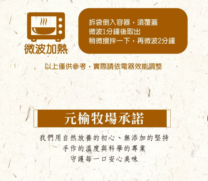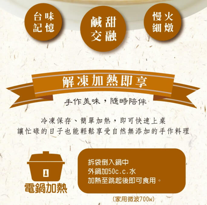 | 調理建議: | 電鍋加熱:解凍後拆袋倒入容器,外鍋加水50c.c,加熱至開關跳起,再燜煮約2分鐘即可起鍋。 微波加熱:解凍後拆袋倒入容器,加熱1分30秒~2分鐘,攪拌均勻後即可食用。 |