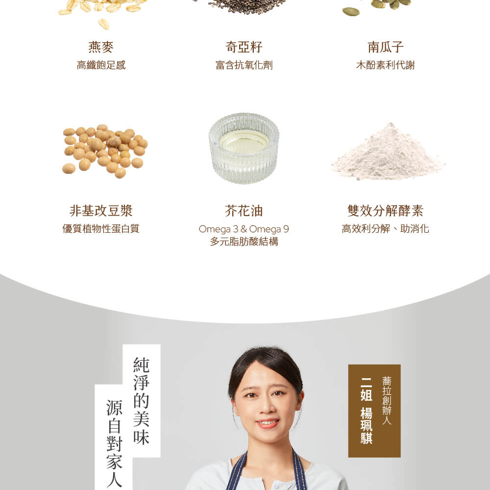 | 成份: | 嚴選大燕麥片、南瓜子、穀豆粉(燕麥、小麥、大麥、紅扁豆、黑糯米、小米、黃豆、青仁黑豆、綠豆、蕎麥)、非基改豆漿(水、非基因改造黃豆)、黑糖、芥花油、抗性澱粉、奇亞籽、帕瑪森起司粉(低溫殺菌低脂乳、鹽、酵素、纖維粉)、起司絲(牛奶、鹽、發酵菌、凝乳酶、玉米澱粉)、 海鹽、雙效分解酵素(澱粉分解酵素、脂肪分解酵素、麥芽糊精、木寡醣) | ||||||||||||||||||||||||||