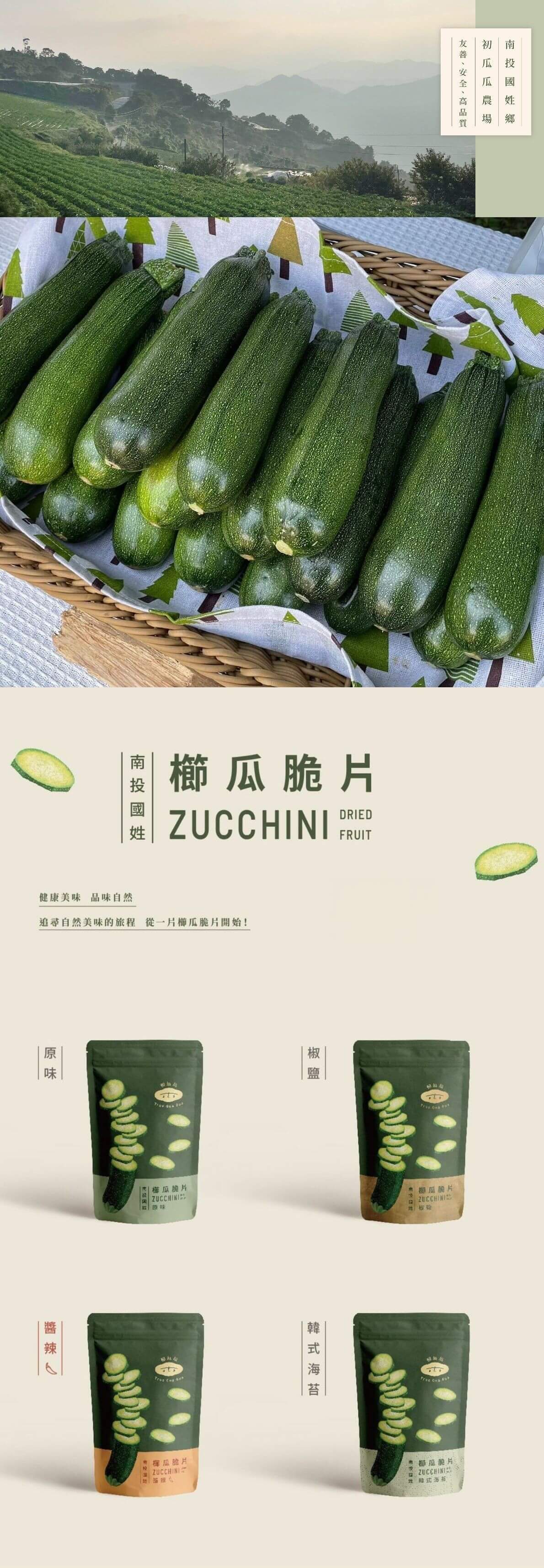 | 特色: | ■ 一群自南投仁愛鄉清流部落的創業青年,為了提供人們更安全、健康的蔬果食材,以友善土地的栽種方式成立了初瓜瓜農場,以安全、高品質履歷夏南瓜(櫛瓜)為主要商品。 ■ 洋芋片般的爽脆口感,並同時提供蔬菜所含的膳食纖維,真材實料即開即食。 ■ 黑胡椒與白胡椒的微辣辛香,與爽脆清甜的櫛瓜脆片是最佳搭配。 |