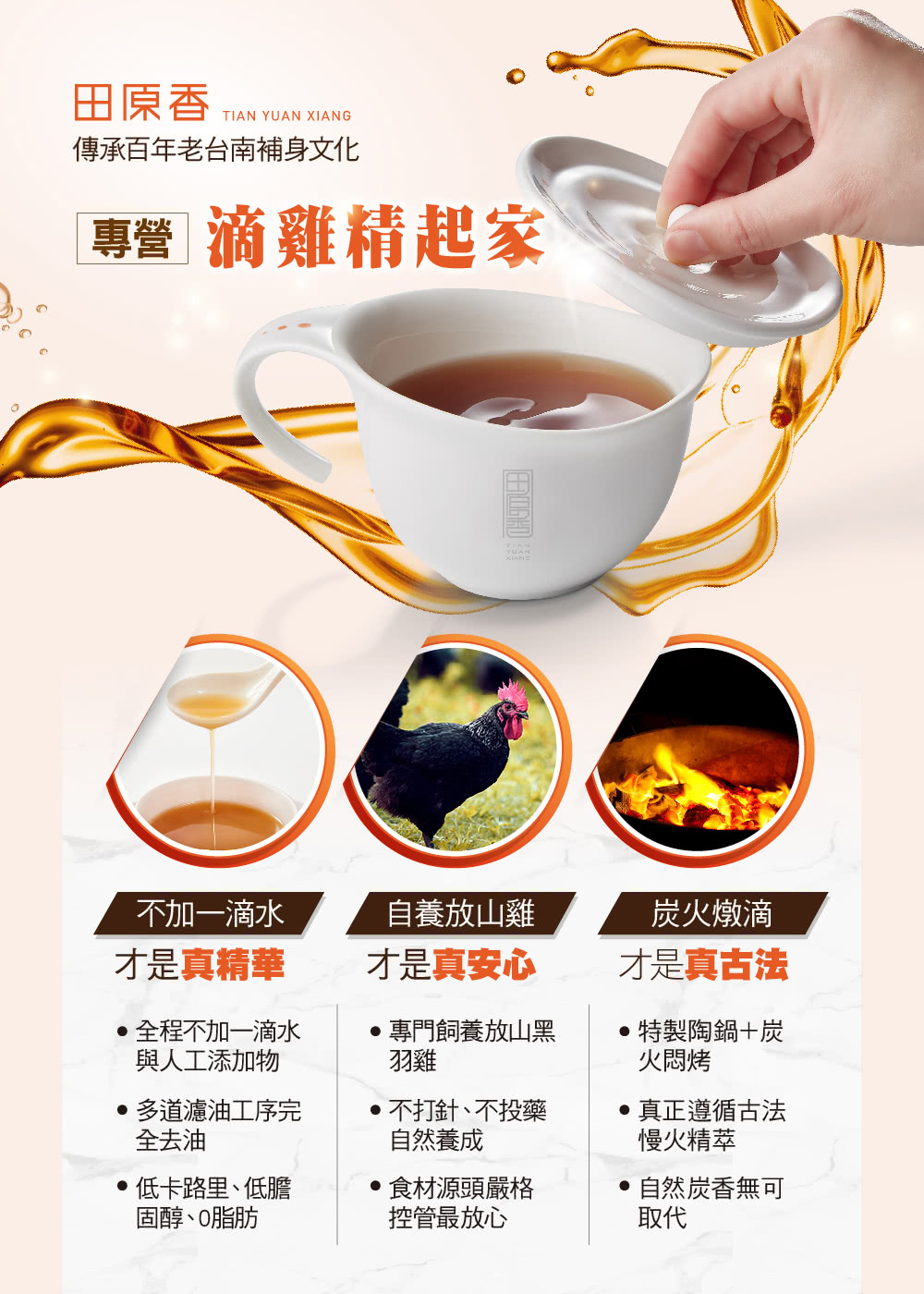 特色: | 滴雞精是運用傳統方法,以手工一滴滴萃取出來的100%純土雞汁,滴雞精含有豐富的膠質,以及蛋白質與側鏈胺基酸等小分子營養,比起一般食物更能讓身體吸收,也是懷孕媽媽補充體力和營養的健康食品。 | ||||||||||||||||||||||||