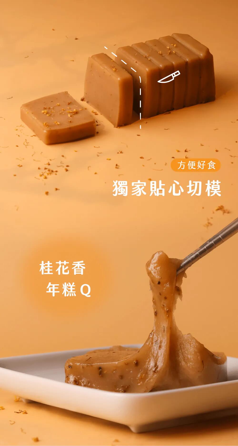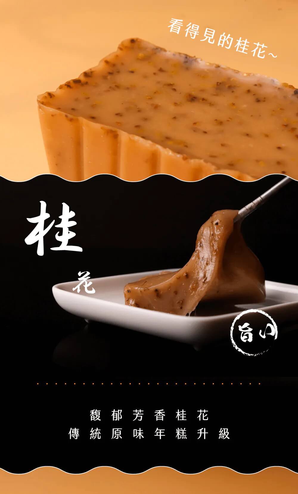| 特色: | ■ 傳統黃澄澄的甜年糕,加入大量乾燥桂花,一口咬下不僅有甜甜米香,桂花獨特的香氣,也會隨著咀嚼蔓延在味蕾之中! ■ 古法傳承甜粿、桂花清香淡雅、無添加防腐劑色素。 ■ 翻轉傳統年糕印象,大量添加在地自然原料,味蕾升級 。 ■ 媒體報導迪化街傳承三代美味,美食部落客強力推薦「必吃年菜」。 ■ 承先啟後,劃時代年糕誕生,色彩繽紛的創新年糕。 |