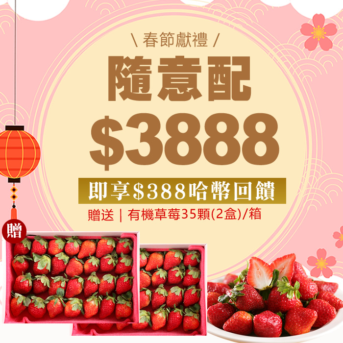 HUG隨意配(購買NT$3888,即得$388 哈幣回饋)+贈苗栗有機草莓35顆(2盒)/箱(年後出貨)